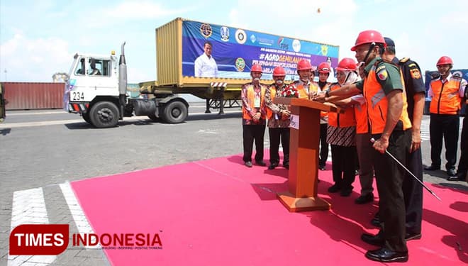 TIMES Manado/Gubernur Jawa Timur. Dra. Hj. Khofifah Indar Parawansa saat melepas ekspor komoditi pertanian di Terminal PetikEmas Surabaya (TPS). Kamis (21/3/2019). (FOTO: TIM Media For TIMES Indonesia)