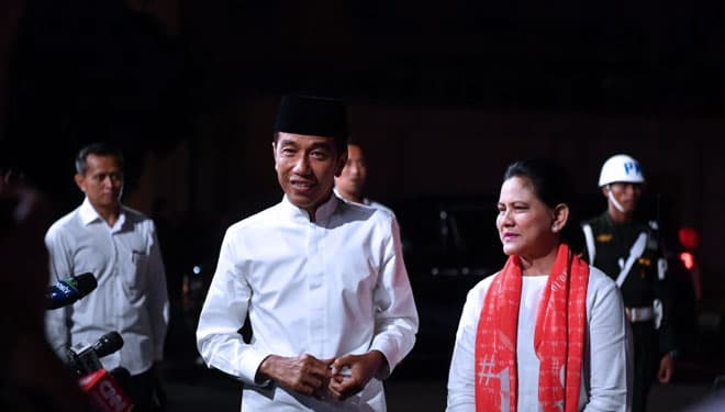 Capres nomor urut 01 Joko Widodo bersama istri Iriana Joko Widodo tiba di lokasi untuk mengikuti debat Pilpres 2019 putaran kelima, di Hotel Sultan, Jakarta, Sabtu (13/4/2019). (FOTO: Rivan Awal Lingga/Antarafoto)
