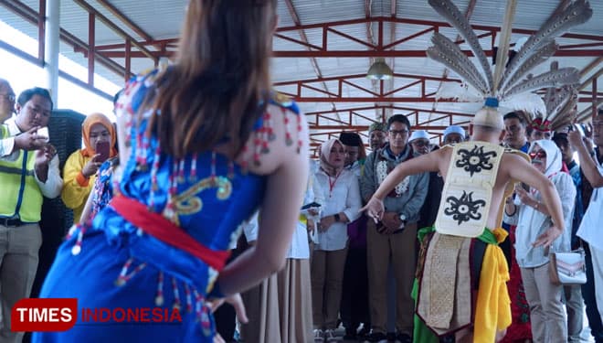 TIMES Manado/Cawapres Nomor urut 02, Sandiaga Salahuddin Uno disambut dengan upacara adat Tetek Pantan saat tiba di Bandara Tjilik Riwut Palangkaraya, Kalimantan, Senin (04/02/2019). (FOTO: Tofik For TIMES Indonesia)
